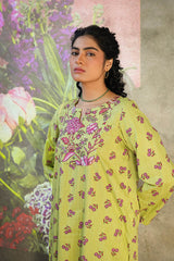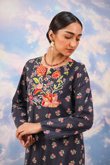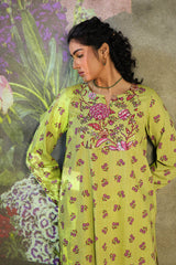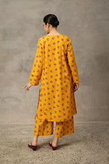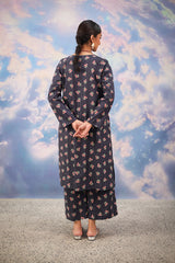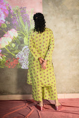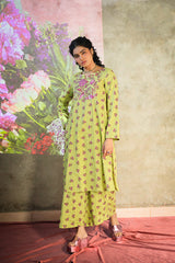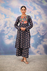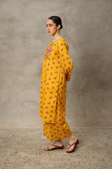 A vibrant floral-printed shirt with a round neckline and V-slit, enhanced with a striking phool-patti design on the bodice and scattered motifs all over. Paired with matching printed culottes for a cohesive look.