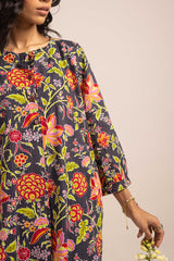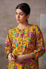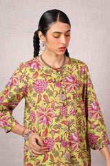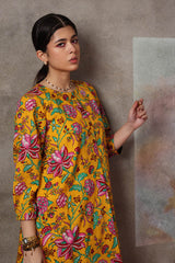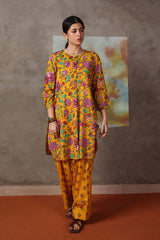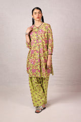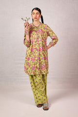 A vintage floral and linear patterned printed relaxed-fit kurta features a round neckline with buttons on the front placket. The cinched sleeves enhance the overall silhouette. Paired with a classic printed loose-fit shalwar, it is detailed with running stitch accents on the ankle hems. The overall ensemble exudes timeless grace.