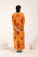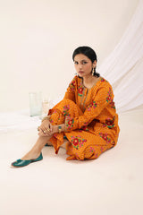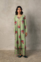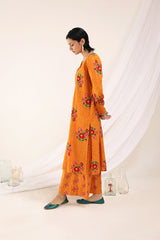 A vibrant straight-fit printed kurta featuring a round neckline, adorned with delicate embroidered details along the placket and accented with buttons. The sleeve hems echo the same intricate embroidery, adding a refined touch. Paired with coordinated printed wide-leg trousers for an effortless look.