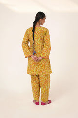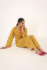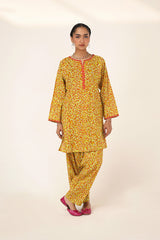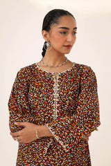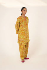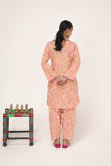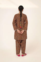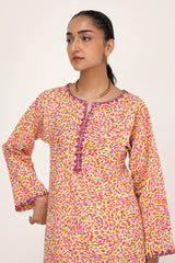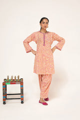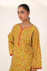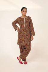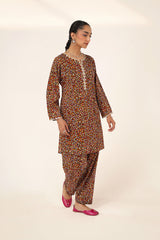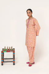 A straight-fit kurta featuring an intricate spiral print, designed with a round neckline and V-slit, both adorned with delicate embroidered details. The sleeve hems echo the same refined embroidery, adding a graceful touch. Paired with a matching printed classic-fit shalwar for a seamless and elegant look.