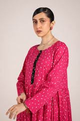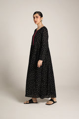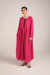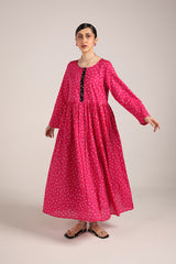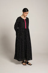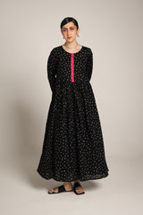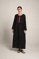 A breezy, long flared frock features a round neckline and a color-blocked front placket, adorned with buttons. The scattered sunflower petal print adds a light, airy vibe, while the gentle gathers around the waist provide a natural, flowing drape to the silhouette.