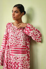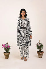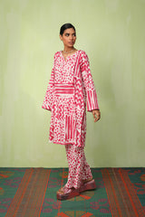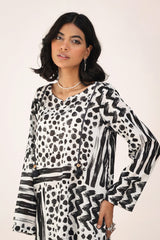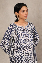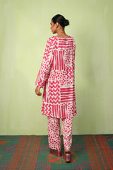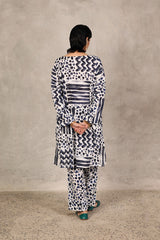An abstract brushstroke-printed kurta featuring a round neckline with a V-slit. The bodice is adorned with thread-braided tassels, enhanced with button details, adding a touch of texture and grace. Paired with contrasting printed straight-fit trousers.