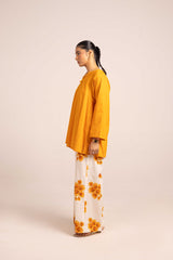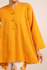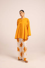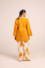 An easy-fit paneled kurti featuring a round neckline with a V-slit and a delicately adorned tassel detail on the placket. Paired with contrast Surajmukhi-printed culottes, it offers a stylish yet sophisticated twist to everyday elegance.