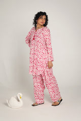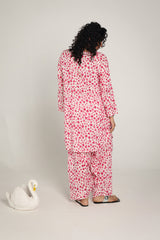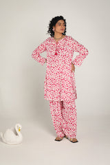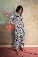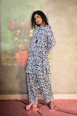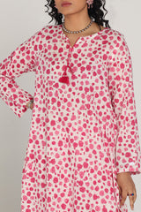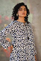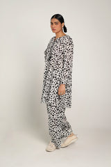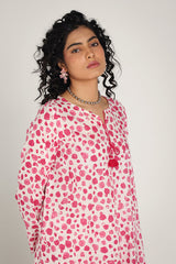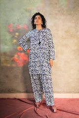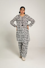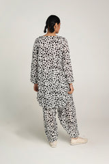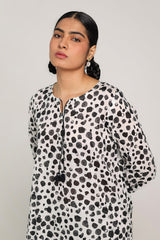 A classic-fit brush spot-printed kurta featuring a round neckline with a V-slit, adorned with tassel detailing. The mid-length silhouette with a rounded hemline adds a refined touch. Paired with a classic-fit shalwar, accented with delicate stitching around the ankle hemline.