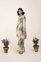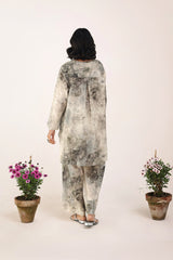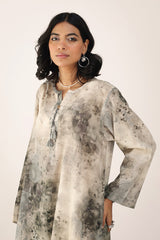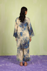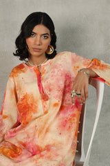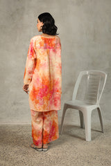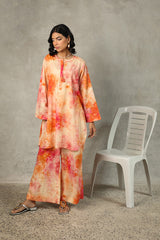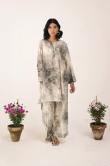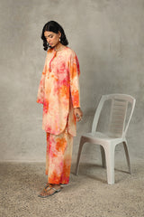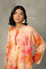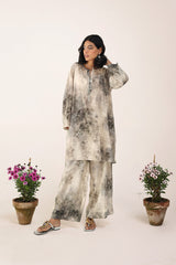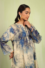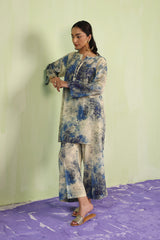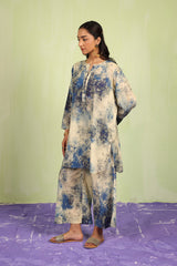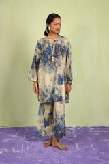 A classic relaxed-fit splash-printed kurta featuring a round neckline with a V-slit, adorned with delicate tassel details. Paired with matching printed culottes for an effortlessly chic look.