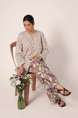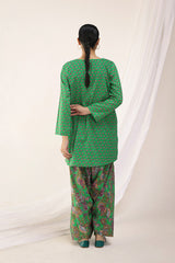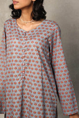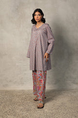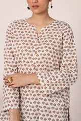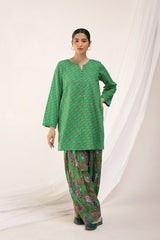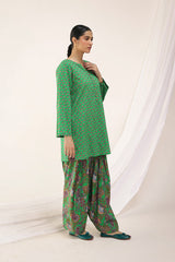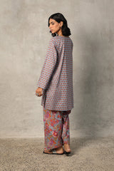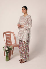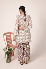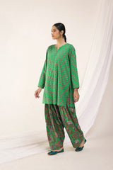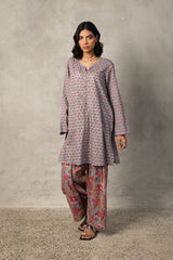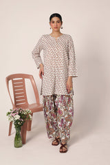 A classic coordinated printed ensemble featuring a relaxed-fit kurta with a round neckline and V-slit, adorned with button details on the placket. Paired with a floral-printed classic farshi shalwar for a timeless look.
