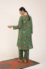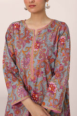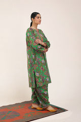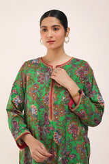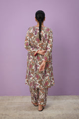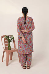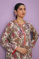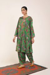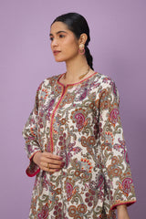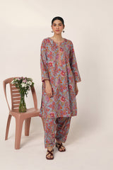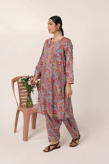 An easy-fit classic floral printed kurta with a round neckline and V-slit, adorned with delicate embroidered details and finished with dori piping. The sleeve hems mirror this intricate embroidery and piping finish. Paired with a matching printed classic-fit shalwar, enhanced with embroidered detailing and dori piping at the ankle hem.