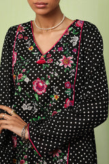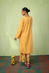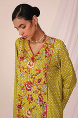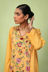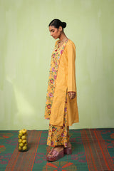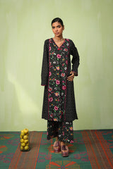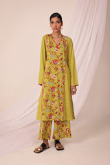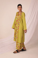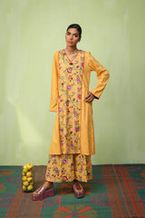 A vibrant printed paneled kurta featuring a V-neckline adorned with delicate tassel details. The neckline, sleeve hem, and panels are accentuated with dori piping, adding a refined touch. Paired with matching printed culottes, this ensemble strikes a perfect balance between tradition and contemporary style.