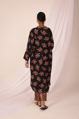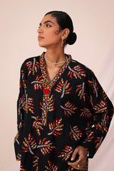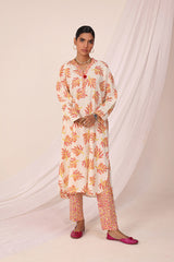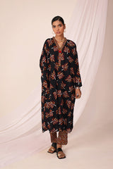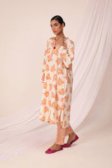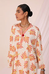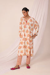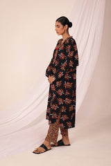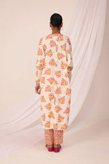 A classic loose-fit leaf-fallout printed kurta featuring a band V-neckline adorned with tassel detailing. Paired with contrasting printed classic straight-fit trousers.