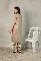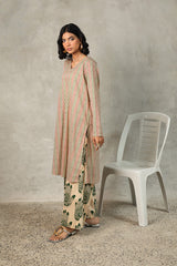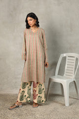 A loose-fit printed kurta in deep mehndi hues, featuring a V-neckline for an effortless appeal. Paired with contrasting mehndi chaap printed classic culottes, creating a seamless blend of tradition and style.