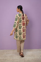 An easy-fit Mehndi printed kurta featuring a V-neckline adorned with tassel detail. The placket, sleeves, and shirt hem are enhanced with contrasting printed borders, adding a striking touch. Paired with coordinated printed classic straight-fit trousers for a cohesive look.