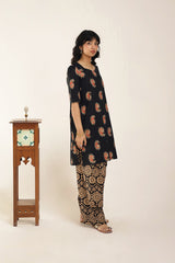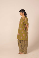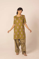 A classic-fit paisley-printed kurta featuring a V-neckline adorned with intricate Mukesh detailing. The puff sleeves add a touch of volume and grace. Paired with a contrasting gota-glow printed farshi shalwar, finished with delicate stitching details on the ankle hemline, creating an effortlessly elegant ensemble.