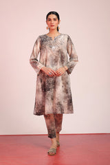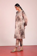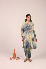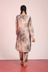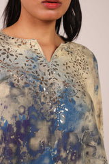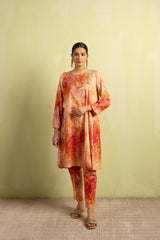 A color-splashed paneled printed kurta featuring a round neckline with a V-slit, delicately adorned with mukaish detailing. Paired with matching printed cigarette trousers, this set blends playful hues with traditional charm for a vibrant, elevated look.