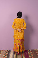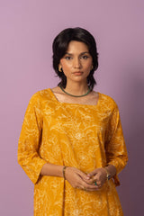 A timeless duotone-printed classic fit kurta featuring a square neckline for a structured yet effortless look. Paired with vivid floral-printed classic culottes, adding a striking contrast and a touch of vibrancy to the ensemble.