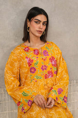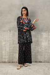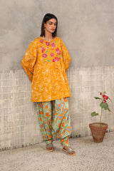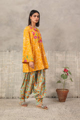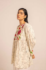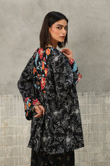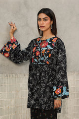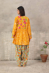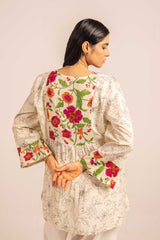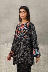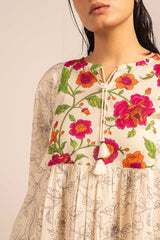 A floral garden-printed peplum featuring a round neckline with tassel details. The bodice and sleeves hem showcases vibrant floral patterns, while gathered details around the empire waist create a graceful, flared silhouette for an effortless look..