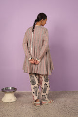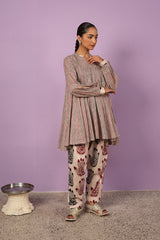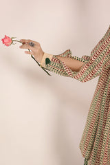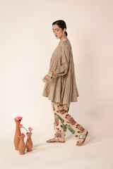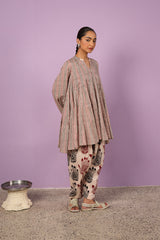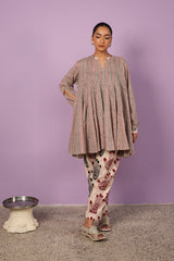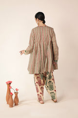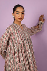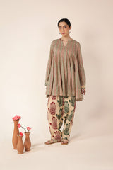 A loose-fit mehndi-hued flared kurta with a band neckline and neckline style, enhanced by soft gathers at the waist for a graceful drape. Paired with an iconic Mehndi Chaap printed classic-fit shalwar featuring delicate stitching details on the ankle hemline.