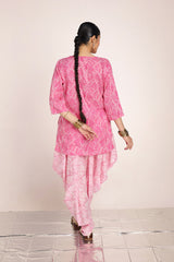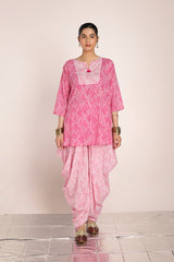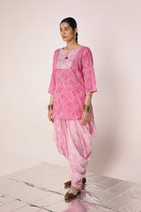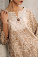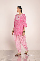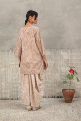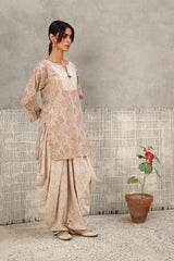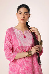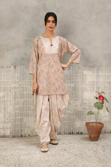 A subtly printed, easy-fit kurta featuring a round neckline with a V-slit, adorned with delicate tassel details. Paired with a color-coordinated printed patiala shalwar, this ensemble blends effortless charm with a touch of tradition and contemporary style.