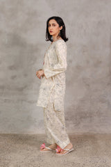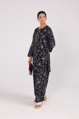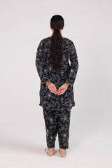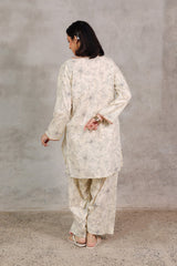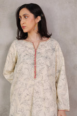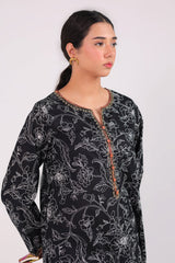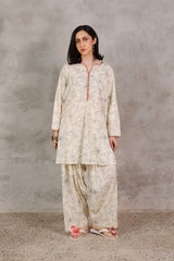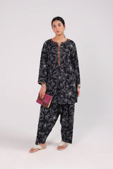 A classic-fit printed shirt with a round neckline and V-slit, adorned with button accents and subtle embroidery. The sleeve hems feature delicate embroidered detailing. Paired with a matching printed classic-fit shalwar.