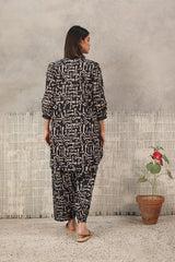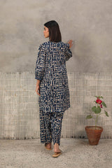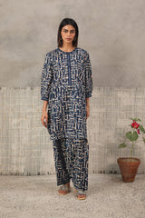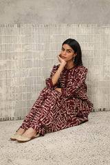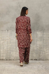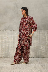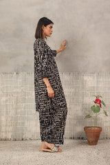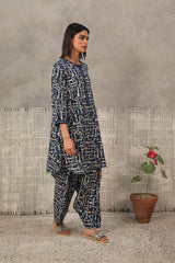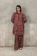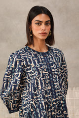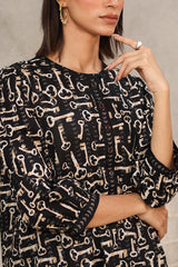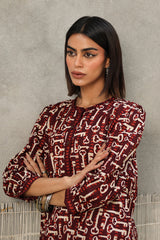 A classic fit printed kurta featuring a round neckline and buttons on the front placket. Adorned with a timeless key motif print, evoking memories of the past. The puff sleeves add a touch of vintage charm, perfectly paired with a matching printed farshi shalwar for an elegant, nostalgic look.