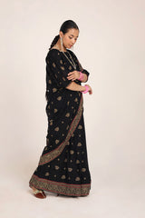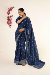 A jacquard-inspired printed saree, draped in classic charm with intricate gold patterns flowing seamlessly. Paired with a structured blouse featuring a square neckline and cinched sleeve hems, adorned with delicate borders, this ensemble blends heritage with effortless sophistication.