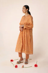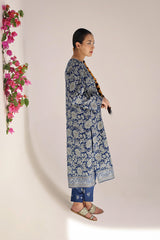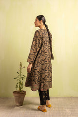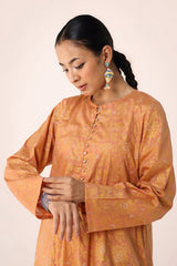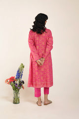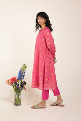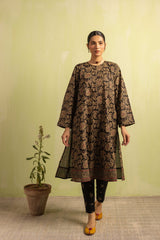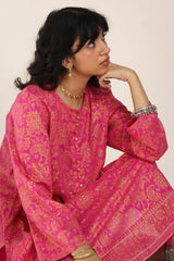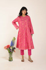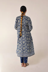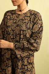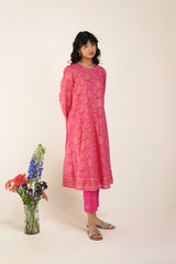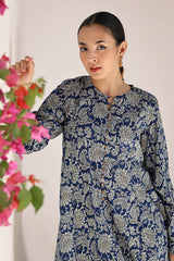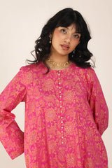 A classic-fit floral printed kurta featuring a round neckline and a front placket adorned with delicate button details. The placket, sleeves and shirt hem are framed with vivid printed borders. Paired with contrasting printed culottes for a statement look.