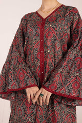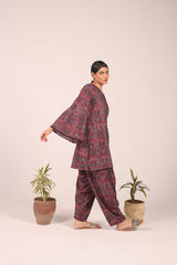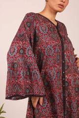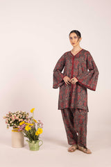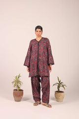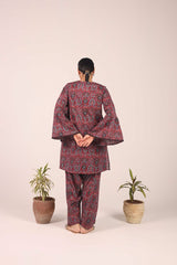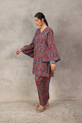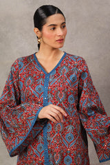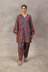 A pure Ajrak-inspired kurta featuring a classic fit with a distinctive B-neckline and a front slit. Vivid printed borders accentuate the neckline, slit, and sleeve hems, while delicate button details add finesse. Paired with a matching printed shalwar..