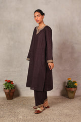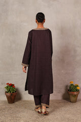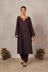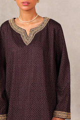 A loose-fit Ajrak-inspired printed kurta featuring a round neckline with a V-slit, adorned with delicate tilla embroidered detailing. The sleeves mirror the same embroidery for a cohesive look. Paired with a matching printed classic-fit shalwar, finished with tilla embroidery on the ankle hem for a traditional yet polished appeal.