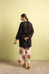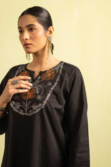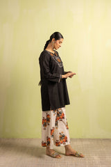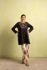 A classic fit solid-hued kurta featuring a round neckline with a V-slit, beautifully adorned with delicate embroidery on the bodice and sleeve hems. Paired with classic contrast-printed straight-fit trousers for a timeless, elegant look.