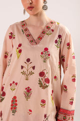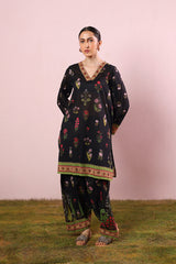 A paneled, vibrant floral printed kurta with a V-neckline. Bursting with bold, blooming florals full of charm. Paired with a matching printed farshi shalwar accented with stitching detail on the ankle hem for a flowing, graceful look.