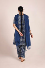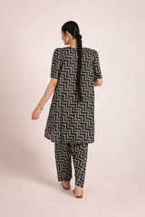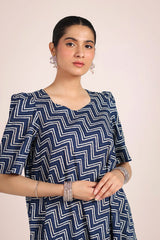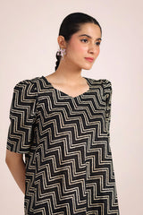A relaxed-fit A-line shirt featuring a subtle zigzag-inspired print and a V-neckline for a flattering touch. Soft puff sleeves enhance the silhouette. Paired with a matching printed classic-fit shalwar for an effortlessly stylish look.
