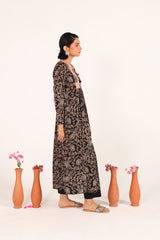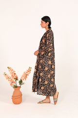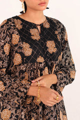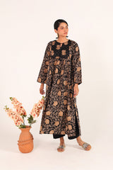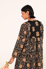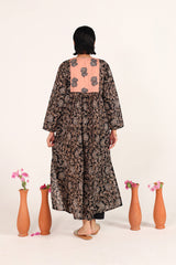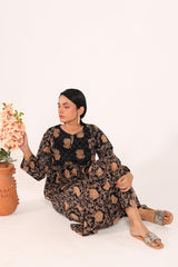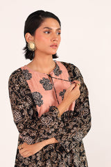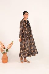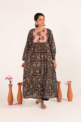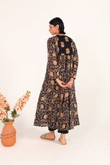 A long flared kurta with a gulab-printed pattern, featuring a round neckline and V-slit adorned with tassel detailing. The vibrant printed bodice is enhanced with stitching accents, while gathers at the empire waist create a flowing silhouette. Pair with any Generation lowers for a classic look.