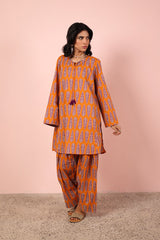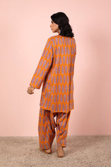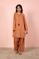 An easy-fit, vibrant printed kurta featuring a round neckline with a V-slit, accented by playful tassel detailing. Paired with a matching printed farshi shalwar, highlighted by intricate stitch detailing at the ankle hem.