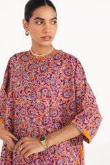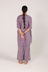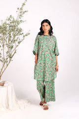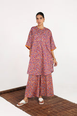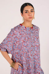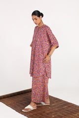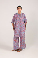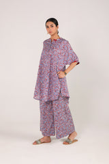 A printed shirt featuring a round neckline and batwing sleeves. Button detailing along the front placket and side pockets add comfort and style. Paired with matching printed culotte trousers.