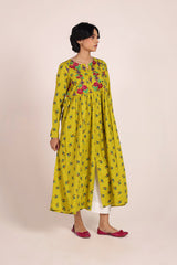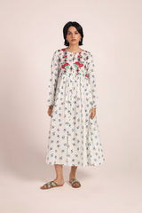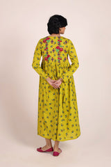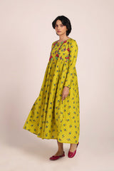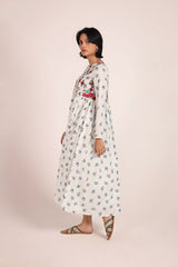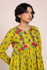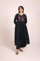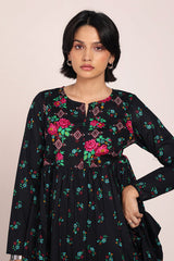 A long, flared frock featuring a round neckline with a V-slit, adorned in a vibrant Balochi floral print that breathes life into the silhouette. Gathers around the empire waist create a flowing, dancing flare. Pair it with any Generation bottoms for a complete classic look.