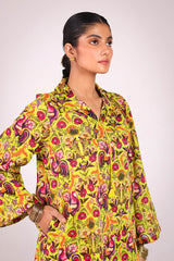 A classic-fit kurta featuring a collar band neckline with charming tassel detailing. The lively print blends vibrant folk-inspired motifs and rich traditional colors. Paired with matching printed culottes for a fresh, vibrant ensemble.