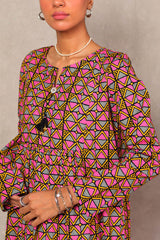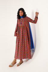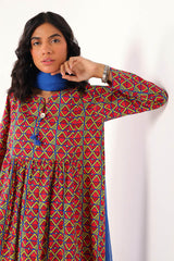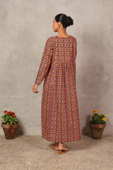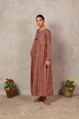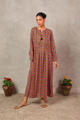A long, flared printed frock featuring a round neckline and V-slit adorned with tassel detailing. Gathers at the empire waist create a flowing, dancing silhouette. Can be paired with any contemporary bottoms for a stylish look.