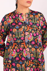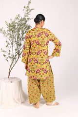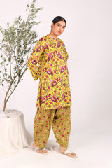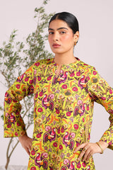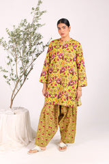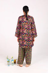 A vibrant, lively printed classic-fit kurta featuring a round neckline with a V-slit. The bold print brings the silhouette to life. Side functional pockets for added ease and style. Paired with a contrast printed farshi shalwar, finished with subtle stitching detail at the ankle for a statement yet relaxed look.