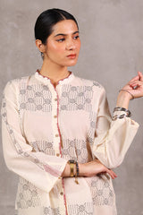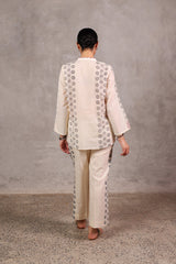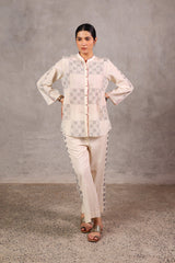 A Hand block-printed button-down shirt featuring a band neckline and front placket buttons. Delicate stitching accents the neckline and front slit, adding subtle charm. Paired with matching printed culottes, this ensemble offers effortless style and comfort perfect for casual yet refined look.