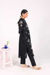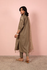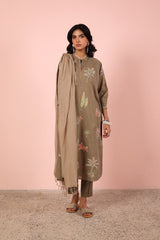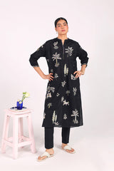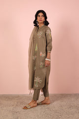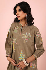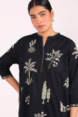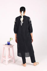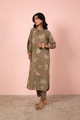 An embroidered kurta featuring a round neckline with vibrant stitching accents and colorful Gulbaag motifs. Cinched sleeves are delicately detailed with color embroidery. Paired with solid straight-fit trousers for a refined and artistic look.