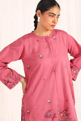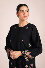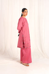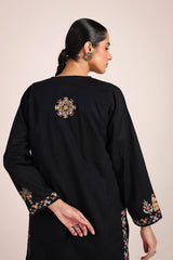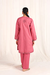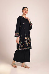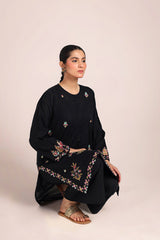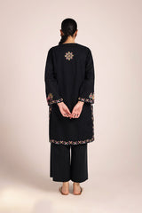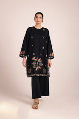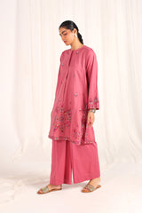 An embroidered paneled kurta features a round neckline, adorned with delicate, soft-colored embroidery on the sleeves and shirt hems. The artful embroidery adds a lively touch, while the back showcases a subtle embroidered motif. Paired with classic culottes for a timeless look.