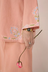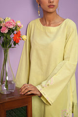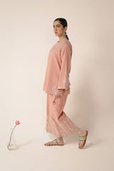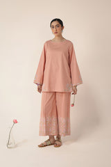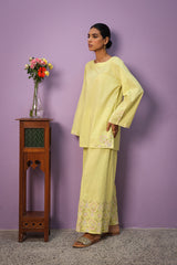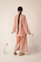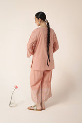 A classic-fit pastel-hued kurta with a round neckline, adorned with subtle self-embroidered details. The sleeve and shirt hems feature delicate pastel Gulbahar embroidery. Paired with solid-hued culottes, accented with intricate floral embroidery in pastel tones.