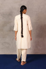 A crystal white, classic-fit flared kurta featuring a band V-neckline and buttoned front placket. Delicate pleats on the bodice add graceful structure, while the sleeve hems are finished with subtle lace trim. Adorned with floral applique and detailing, with soft gathers at the back for a gentle flare. Paired with a classic-fit shalwar.