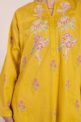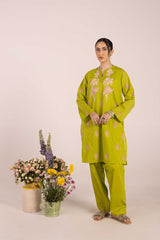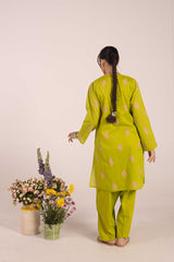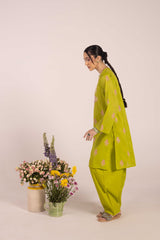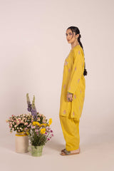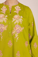 A block-printed paneled shirt featuring a round neckline with a V-slit, adorned with delicate stitching on the neckline and floral embellishment along the placket. Hand block-printed motifs and embroidered detailing enhance the shirt’s artisanal appeal. Paired with a classic-fit shalwar, finished with subtle stitching at the ankle hem for a refined touch.