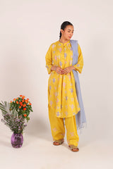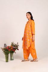 A classic-fit block-printed kurta featuring a band neckline, accentuated with contrast stitching and button detailing on the front placket. Adorned with all-over floral motifs, it pairs with a matching classic-fit shalwar, finished with subtle stitching on the ankle hem.