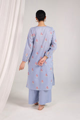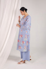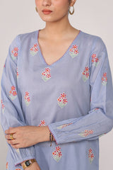 A floral block-printed, classic-fit kurta featuring a V-neckline adorned with delicate stitching details. Vibrant block-printed motifs are enhanced with subtle embroidery, adding depth to the design. Cinched sleeve hems are finished with fine stitching accents. Paired with solid culottes for a balanced, effortless look.