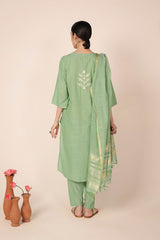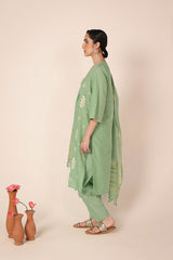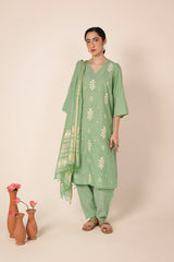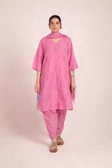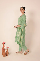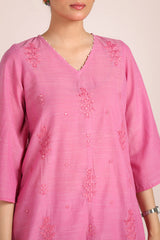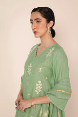 An embroidered V-neck shirt enhanced with beadwork, adorned with intricate gulbpoti motifs highlighted by Aina work. The sleeve hems feature fine stitch detailing, adding subtle charm. Paired with pegged shalwar accented with buttons at the ankle. The ensemble is completed with a two-tone dupatta featuring denier borders and soft frills.