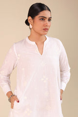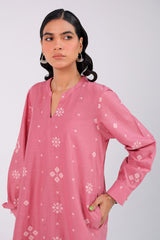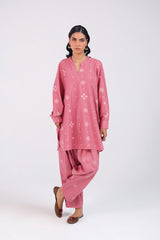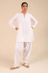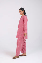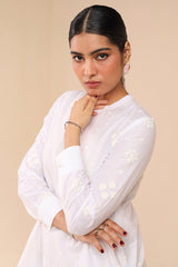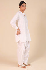 An embroidered shirt featuring a round neckline with a V-slit, adorned with delicate embroidery throughout. Designed with cuffed sleeves and side pockets for added ease. Paired with a matching classic-fit shalwar to complete the look.