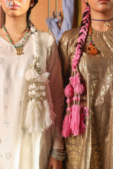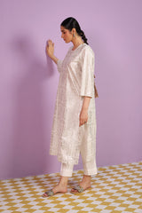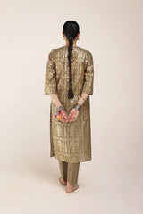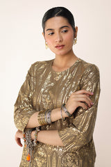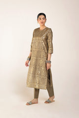 A foil printed shirt featuring a round neckline with a side keyhole. Adorned with the exquisite Husn-e-Mahal foil print, it radiates regal elegance. Paired effortlessly with solid-hued straight-fit trousers, this ensemble defines timeless sophistication.