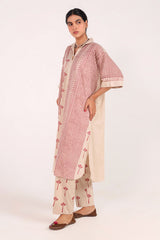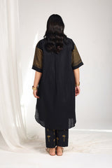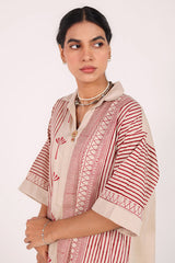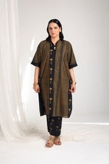 A block-printed classic-fit kurta featuring a band collar neckline with a V-slit, adorned with button detailing. The artisanal block print lends heritage charm and visual depth to the piece. Paired with contrast-printed straight-fit trousers for a look that blends tradition with contemporary flair.