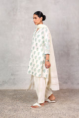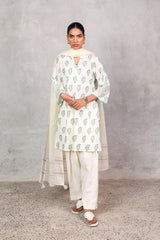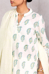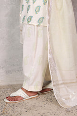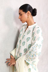 A paisley hand blocked printed classic-fit kurta featuring a band neckline with a V-slit, finished with shell button detailing. The sleeve hems are adorned with delicate hand crochet for a soft finish. Paired with a printed classic fit shalwar, and a lurex voile dupatta with golden panni borders, gota and tassel accents for a festive touch.
